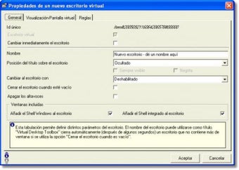 Virtual Desktop Toolbox, con una interfaz multilingüe que incluye soporte para español, permite configurar diversas opciones para cada Escritorio, y cambiar entre ellos aplicaciones, ventanas y otros elementos, personalizando de manera única cada espacio de trabajo.
